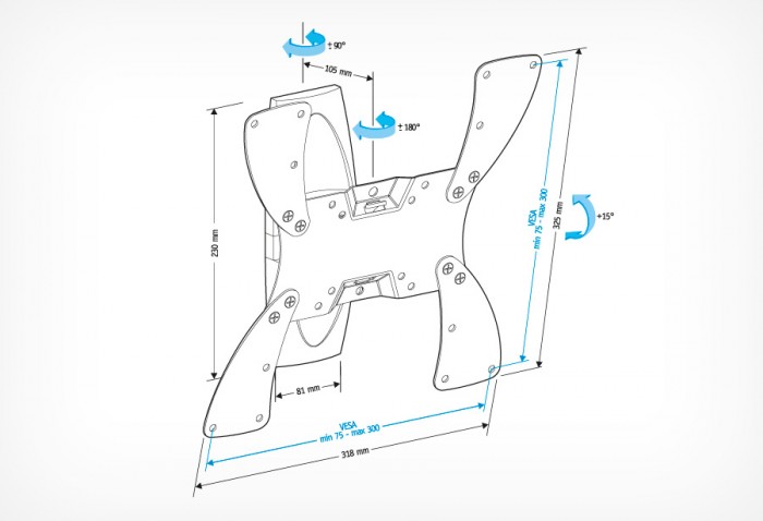 Диагональ экрана 19″ – 40″ Нагрузка Выдерживает вес до 30 кг Крепежные отверстия 75х75, 100х100, 200х100, 200х200, 200х300, 300х300 мм Угол наклона 15⁰ – 25⁰ Угол поворота 50⁰ Расстояние от стены 105 мм Цвет черный