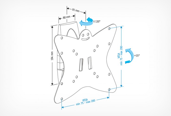 Диагональ экрана 19″ – 37″ Нагрузка Выдерживает вес до 30 кг Крепежные отверстия 75х75, 100х100, 200х100, 200х200 мм Угол наклона 6⁰ – 15⁰ Угол поворота 135⁰ Расстояние от стены 91 мм Цвет черный