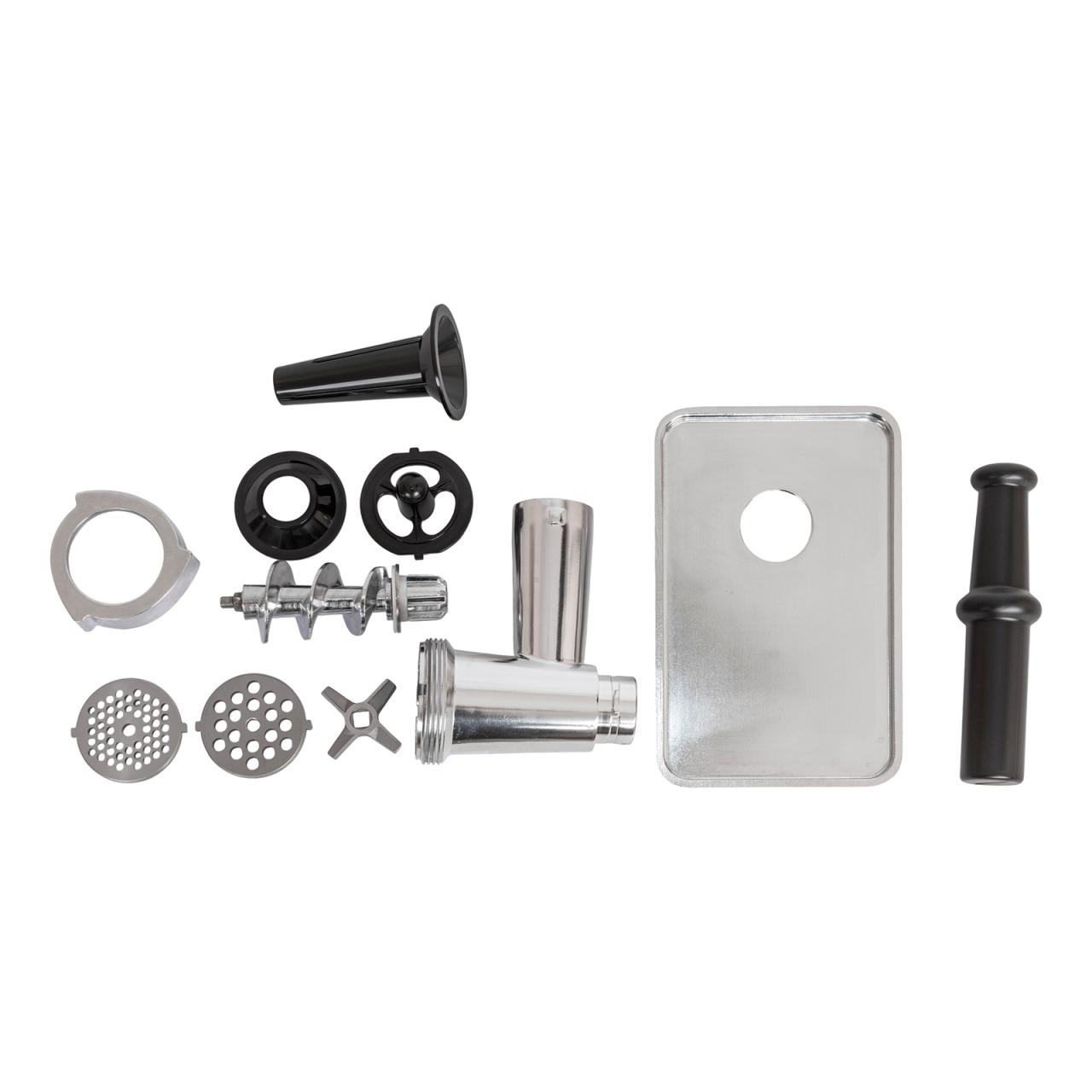 - Комплектация: мясорубка, металлический загрузочный лоток, толкатель для продуктов, 2 решетки, насадка для приготовления сосисок, насадка для приготовления кеббе, руководство по эксплуатации, гарантийный талон